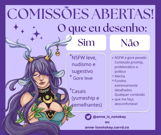 20 . ela/dela . BROlá! Me chamo Anne e sou uma artista autodidata do brasileira! Desenho principalmente por hobby focando nos meus interesses atuais, mas também estou disponível para trabalhar em encomendas para dar vida aos seus pedidos!Status das comissões: ABERTAS!
