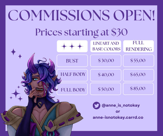 Fico feliz que tenha se interessado no meu trabalho!! Aqui você vai encontrar os valores da minha arte e, além de algumas informações adicionais e meus termos de serviço. Estou ansiosa para trabalhar com você! :D