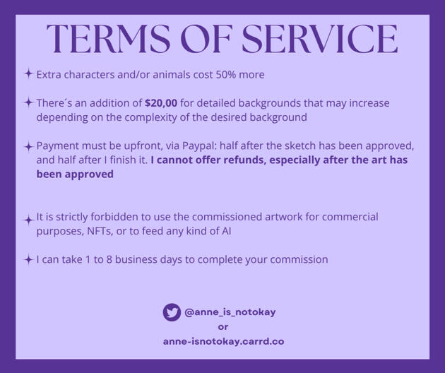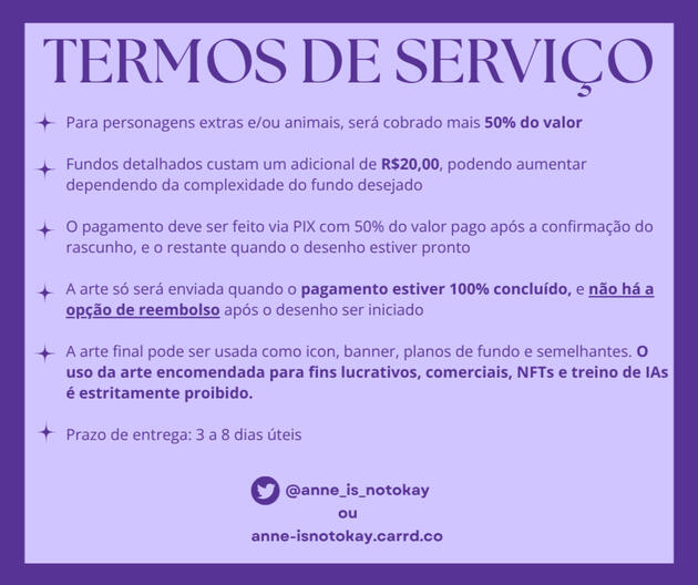 Fico feliz que tenha se interessado no meu trabalho!! Aqui você vai encontrar os valores da minha arte e, além de algumas informações adicionais e meus termos de serviço. Estou ansiosa para trabalhar com você! :D